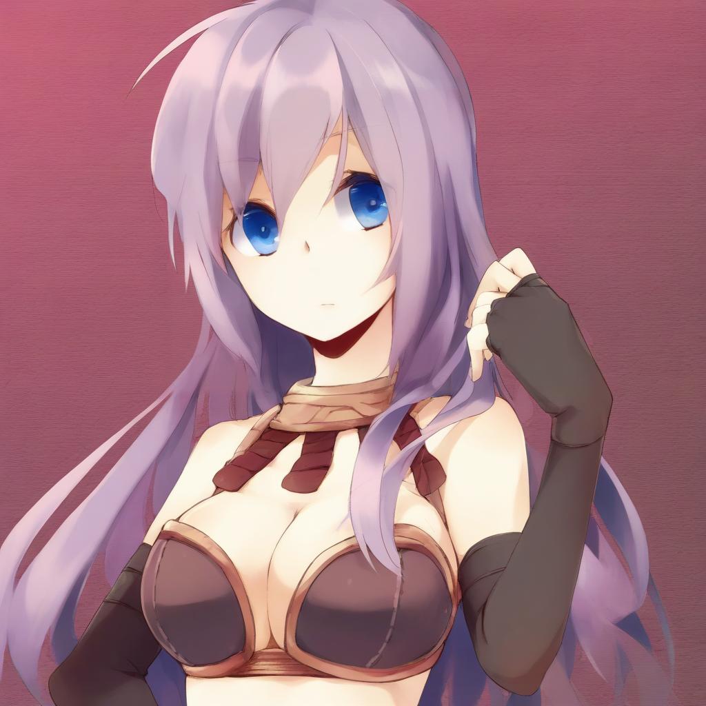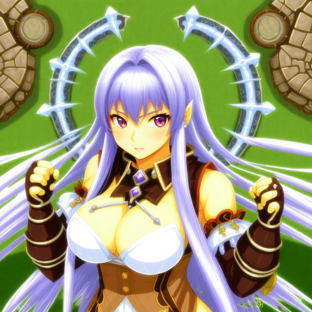 Alchemist (ragnarok online), ragnarok online, 1girl, long hair, large breasts, medium breasts, cleavage, elbow gloves, fingerless gloves, by artist senomoto hisashi, leet