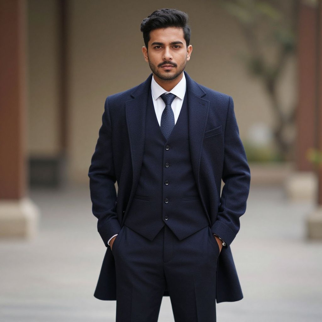Kani pashmina suit, 1boy, male focus, solo, vest, facial hair, necktie, hands in pockets, pants, mustache, shirt, coat, black hair, white shirt, blurry, jacket, looking at viewer, standing