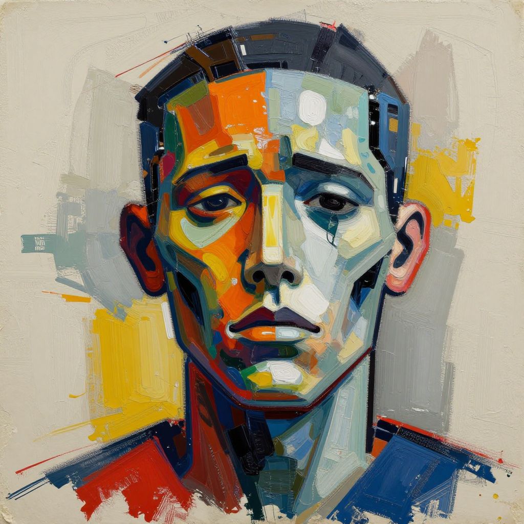 Frotal as a symbolic representation of front-facing emotions, abstract expressionist style with bold, vivid paint strokes, a blend of human and robotic facial features, dynamic color contrast, intense mood, textured canvas effect --v 5 --ar 5:4