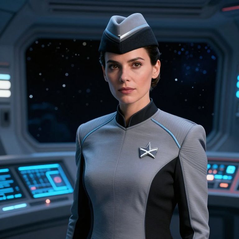 A realistic photographic portrait of a female Starfleet officer in a sleek, futuristic sci-fi uniform, standing in a dimly lit starship bridge with holographic controls glowing around her. She has sharp, determined features with deep brown eyes, a strong jawline, and a calm, focused expression. The uniform is silver and black with subtle glowing blue trim, and she wears a standard Starfleet hat with a white insignia. The setting shows a vast space view through the observation window in the background.