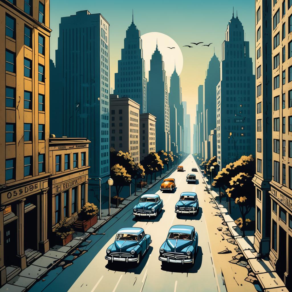 A high perspective view of a city street with tall buildings on either side, vintage cars driving along a cracked road, comic book style with bold black outlines and saturated shadows, urban environment with gritty details, muted blue and ochre color tones, dramatic lighting casting long shadows