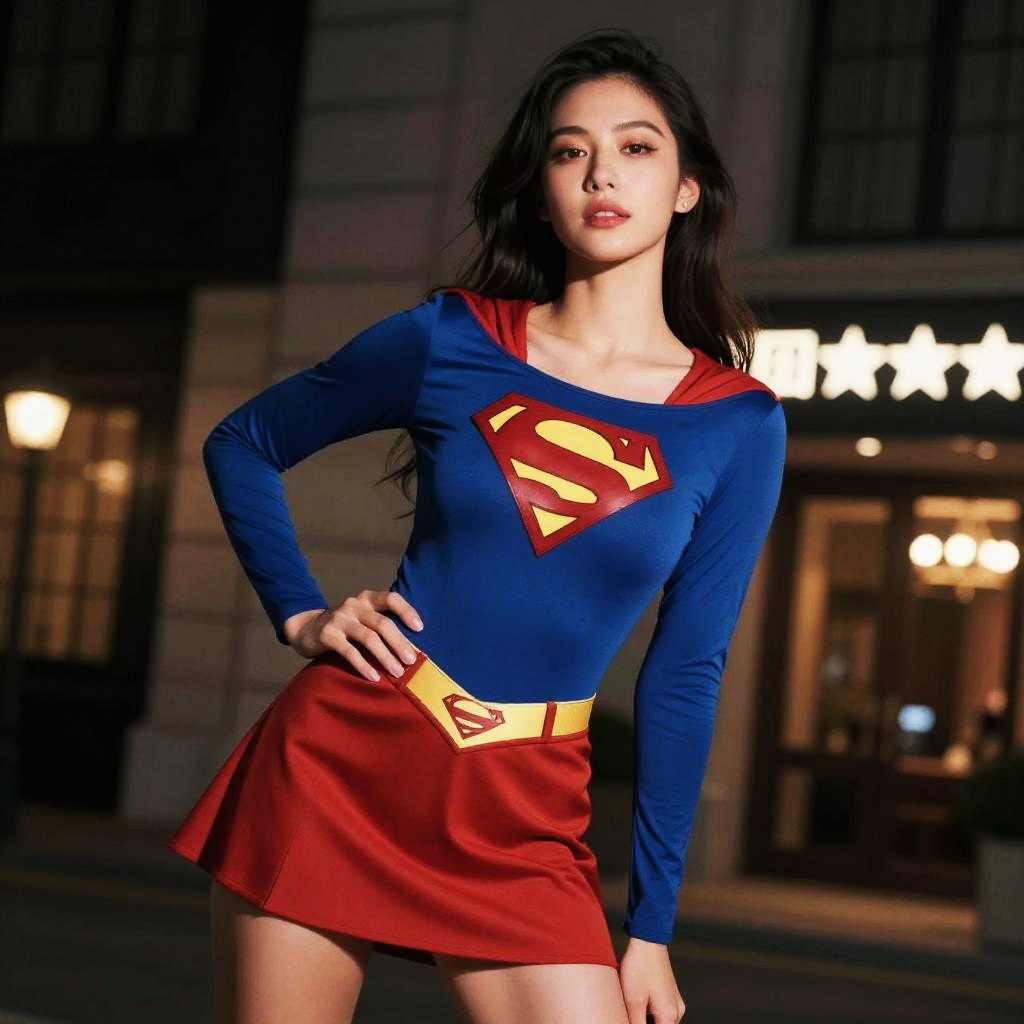 Woman posing for a photo, (wearing supergirl_cosplay_outfit:1.3), mini_skirt, good hand, 4k, high-res, masterpiece, best quality, head:1.3, ((Hasselblad photography)), finely detailed skin, sharp focus, (cinematic lighting), collarbone, night, soft lighting, dynamic angle, [:(detailed face:1.2):0.2], (((5 stars hotel))), outside