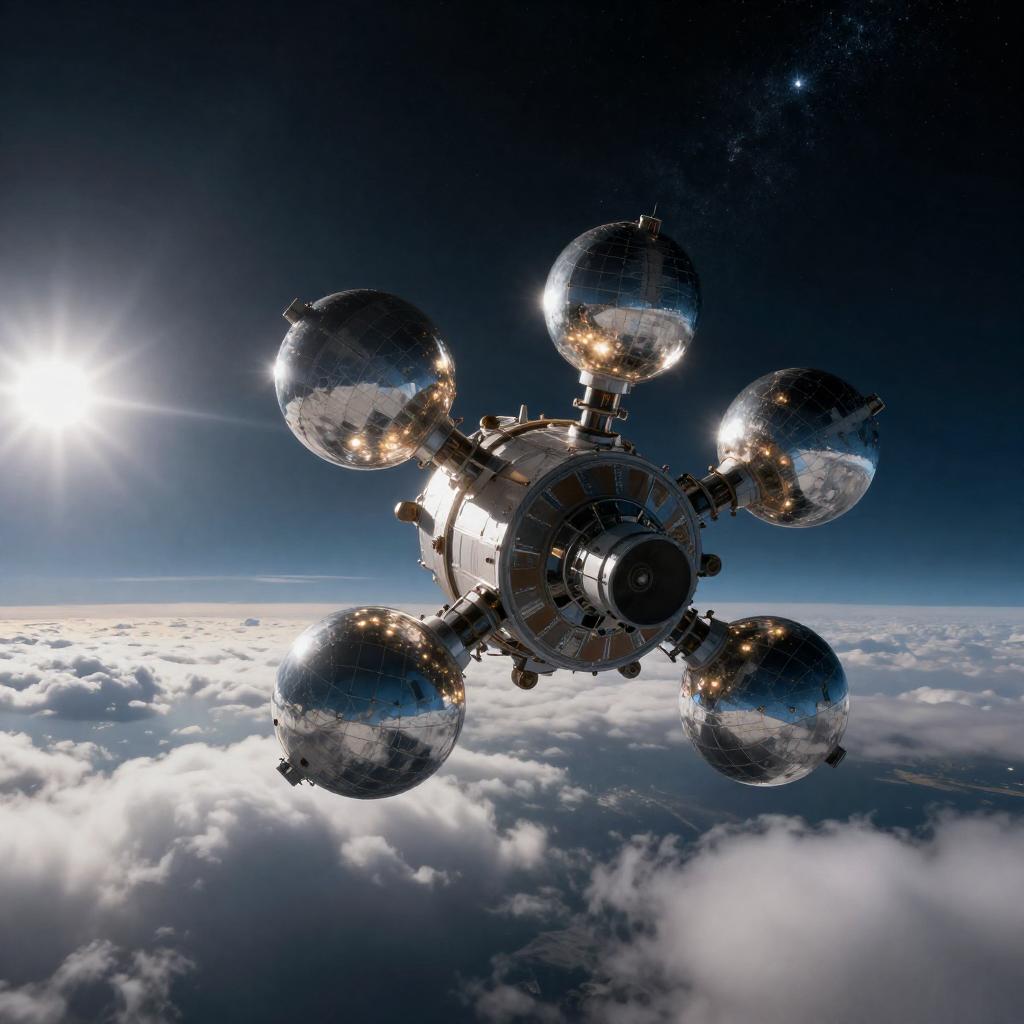Spacecraft with four large, illuminated, spherical sensors flying above a sea of clouds. Dark starry sky in the background. Bright light from a planet on the left. Spacecraft in the center, partially above clouds. Starry sky with visible stars.
