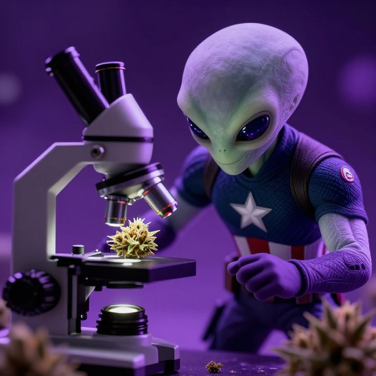 Captain America alien-like creature, analysis cannabis buds on a microscope, deep space, curious, purple haze, photorealistic, 4k,