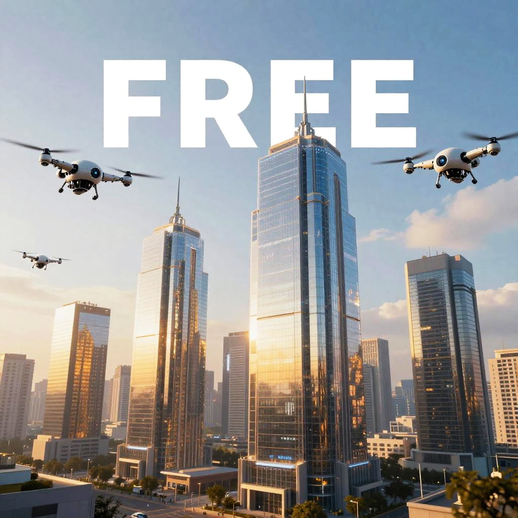 Photograph of a cityscape with tall skyscrapers at sunset, four drones flying above, and large white "FREE" text overlay.