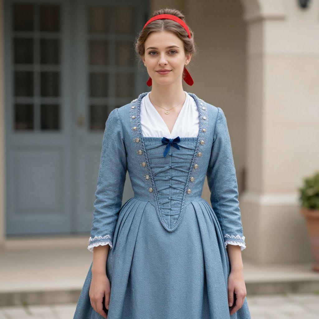 French dress costume, woman in a blue dress with a red headband
