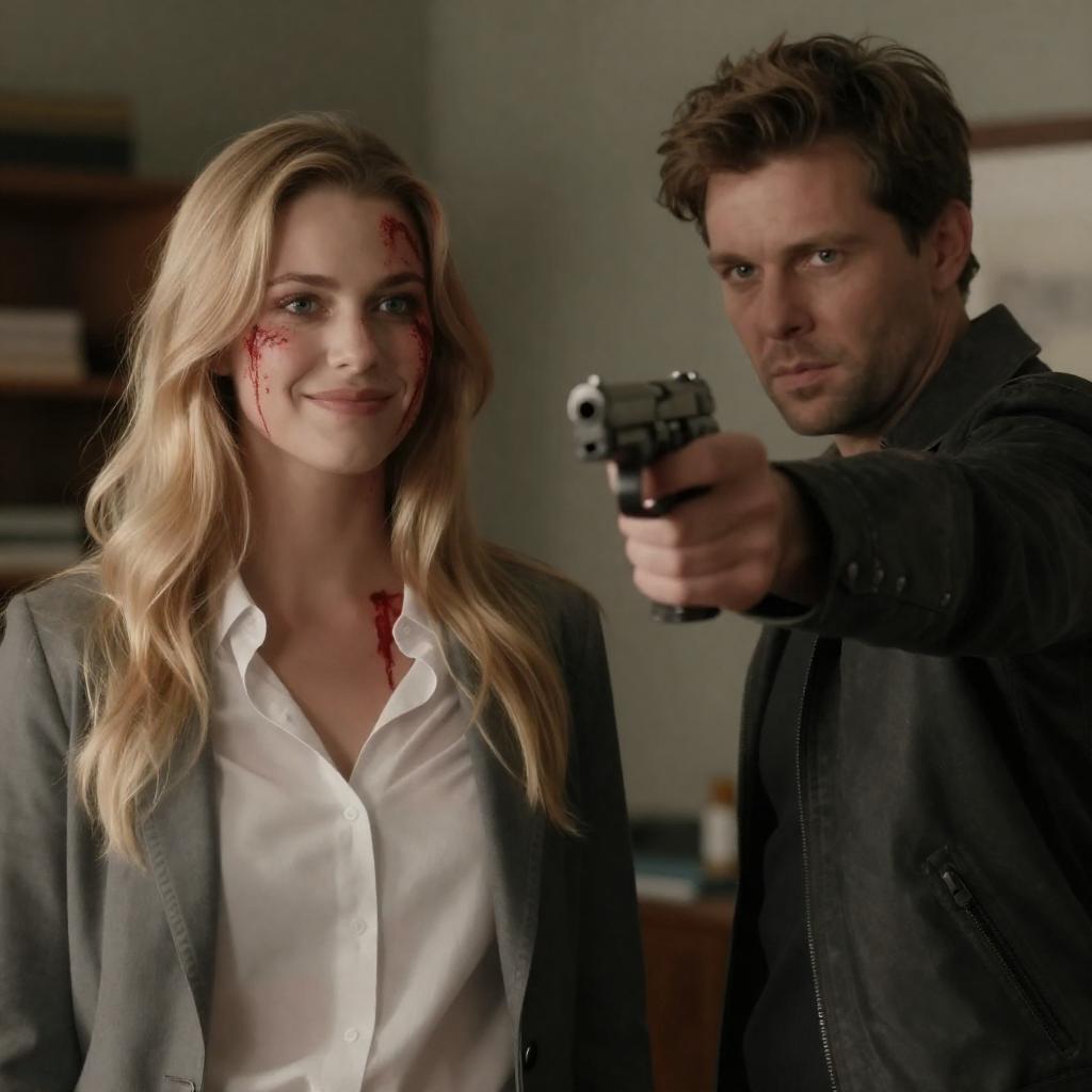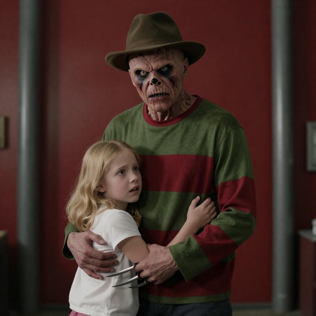 Photograph of two people, a woman with blonde hair in a white jacket and a man in a Freddy Krueger costume with a black hat and red-striped sweater. The man has a wide-open, intense scream, while the woman smiles and claps. Both are seated closely together. The background is dark with a circular light pattern.