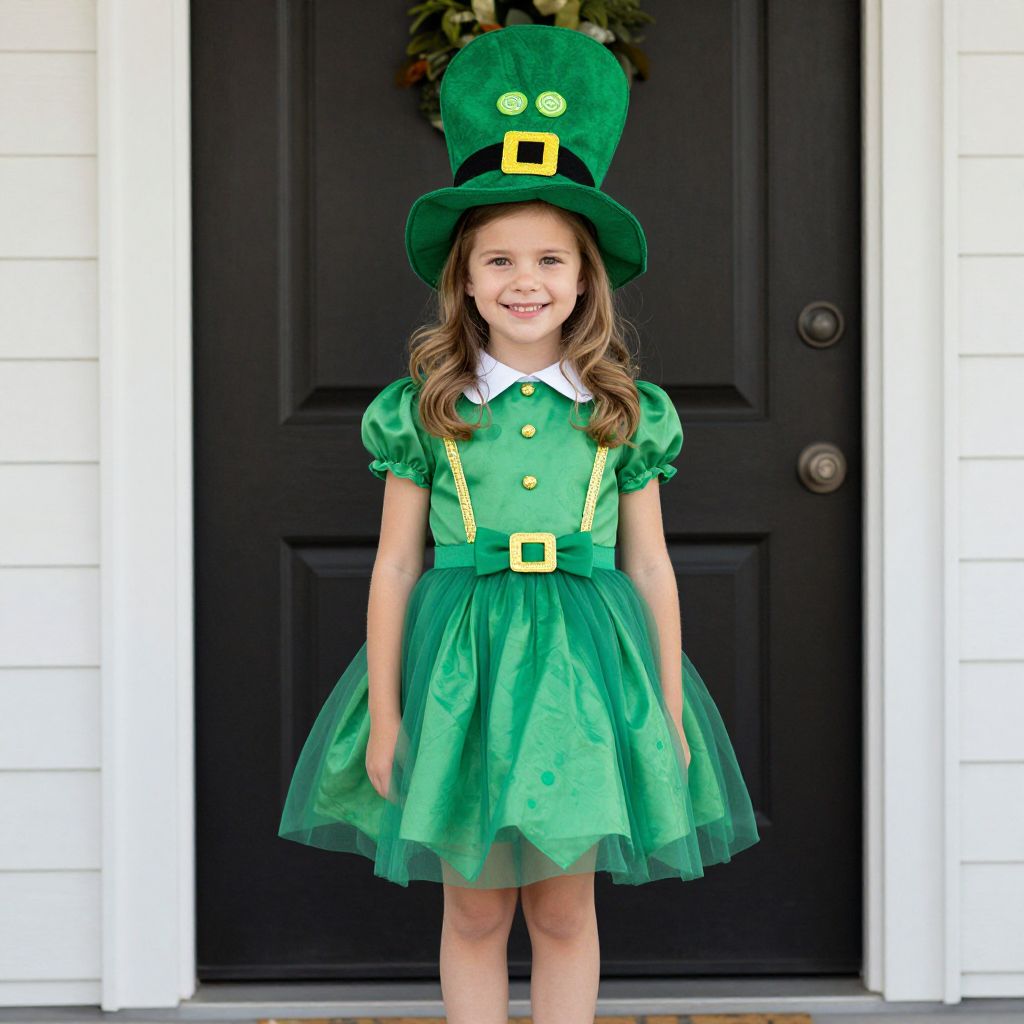 Patricks Day Girl Costume, girl in a green dress and hat standing in front of a door