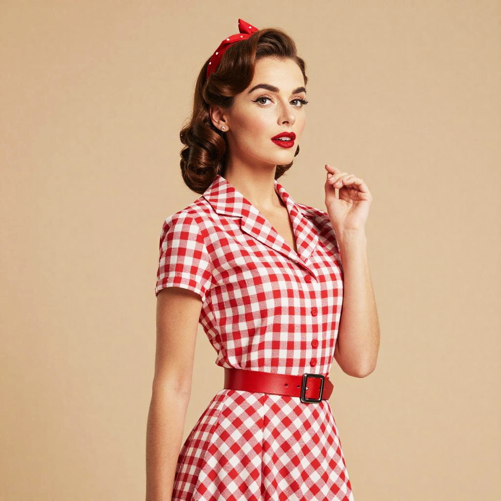 This image features a stylish woman in a classic red and white checkered dress, reminiscent of retro fashion trends. The vibrant colors and vintage aesthetic create a charming atmosphere, highlighting her elegant hairstyle and accessories, perfect for a nostalgic setting.