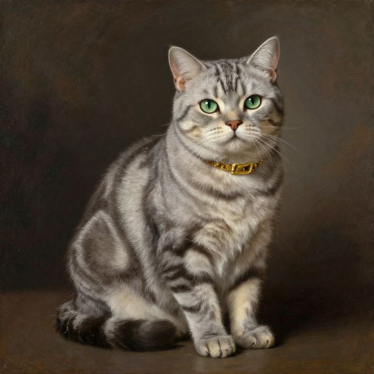 Cross fat grey tabby cat with green eyes, wearing a gold collar, full body portrait, classical oil painting,