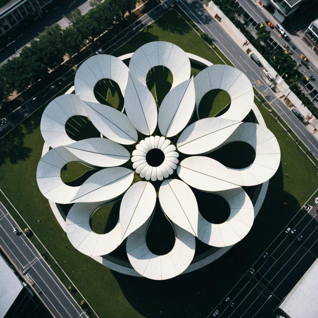 Overhead drone photograph capturing a unique architectural design resembling a flower with a central cylindrical core and seven petal-shaped surrounding structures. The white structures create a symmetrical floral pattern, set in a green landscaped area bordered by roads and urban buildings.