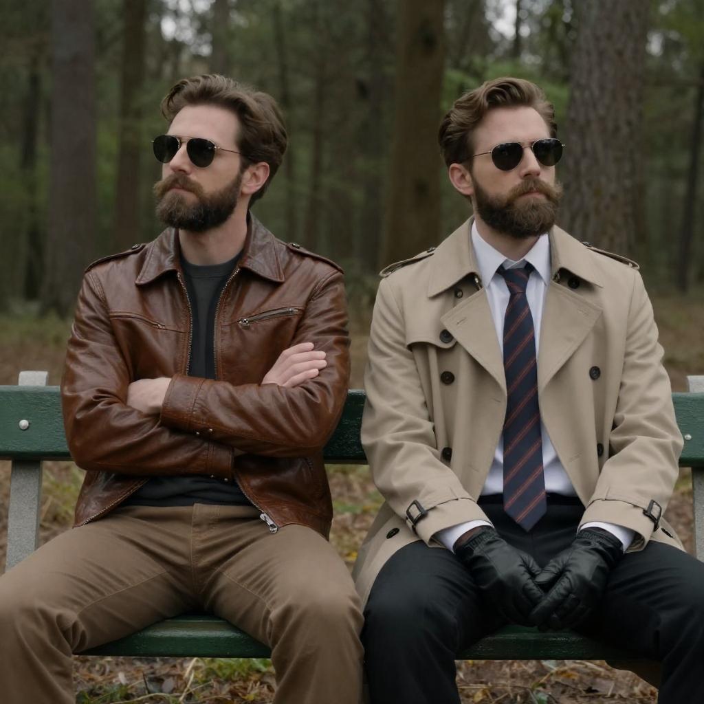 Photograph of three men standing outdoors with a dense leafy background. The center man has a full beard, wears a tan coat over a brown turtleneck, and has his hands in his pockets. The man on the left has blond hair, dressed in a gray suit with a black turtleneck, and his hands are clasped. The man on the right wears glasses, a brown suit, white shirt, and a striped tie. All men have serious expressions.