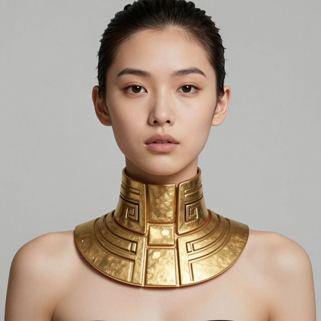 Photograph of an East Asian woman with fair skin and sleek, black hair pulled back. She has a neutral expression and minimal makeup, highlighting her natural features. She wears a large, intricate, gold choker necklace with geometric patterns, covering her neck and part of her upper chest. She is topless, with the focus on her face and the necklace. The background is a simple, light gray, which contrasts with the metallic sheen of the choker. The image has a clean, modern, and minimalist style, emphasizing the cultural and aesthetic elements of the jewelry.