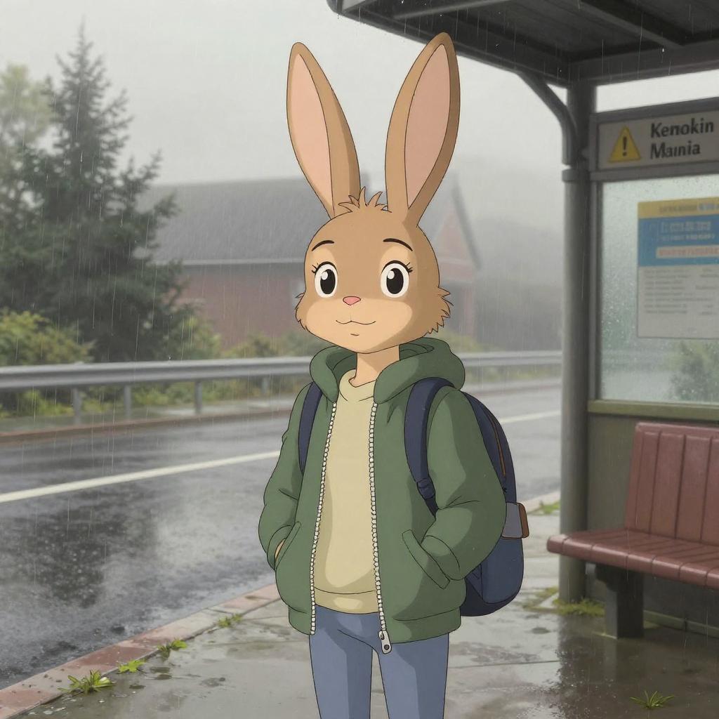 (by Kemokin Mania, by Rikose, by Tofu Froth, by Studio Ghibli), (solo, lola bunny:1.3), (hood jacket, front view, half-length portrait, school bag:1.15), (bus station, foggy, raining, road, plant:1.25), masterpiece, best quality, ultra realistic, 4k, 2k, (intricate:0.9), (high detail:1.25)