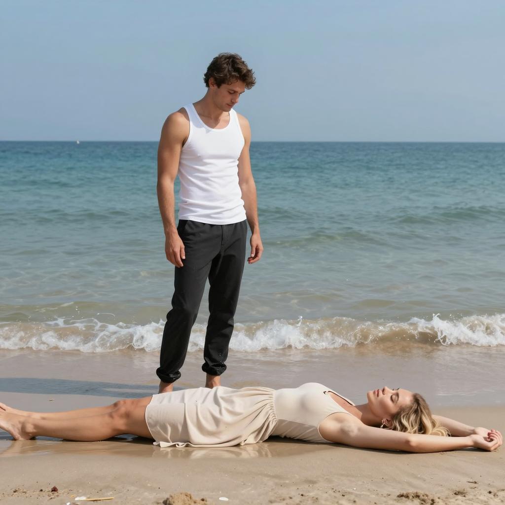 Man with short curly blonde hair, muscular build, wearing black tank top and maroon swim trunks, stands in shallow water. Woman with light brown hair in a bun, slim build, wearing white one-piece swimsuit, faces him. Both look at each other, man gesturing with hands. Ocean in background, mountains on left, clear sky with some clouds.