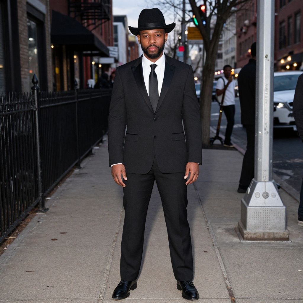 Photograph of a black man in a black suit, white shirt, black tie, and black hat standing on an urban sidewalk, surrounded by city buildings