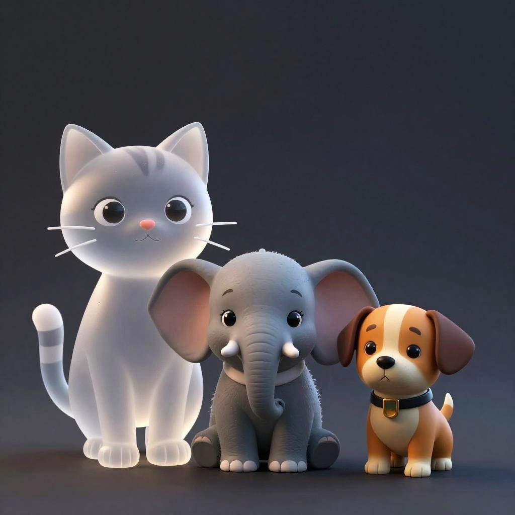 Realistic photo.Translucent a cartoon portrait with three characters: a female cat, a baby elephant, and a boy dog. Portrait, chiaroscuro, holy cinematic lighting, 3D, C4D, blender, gradient background, octane rendering. realistic photo