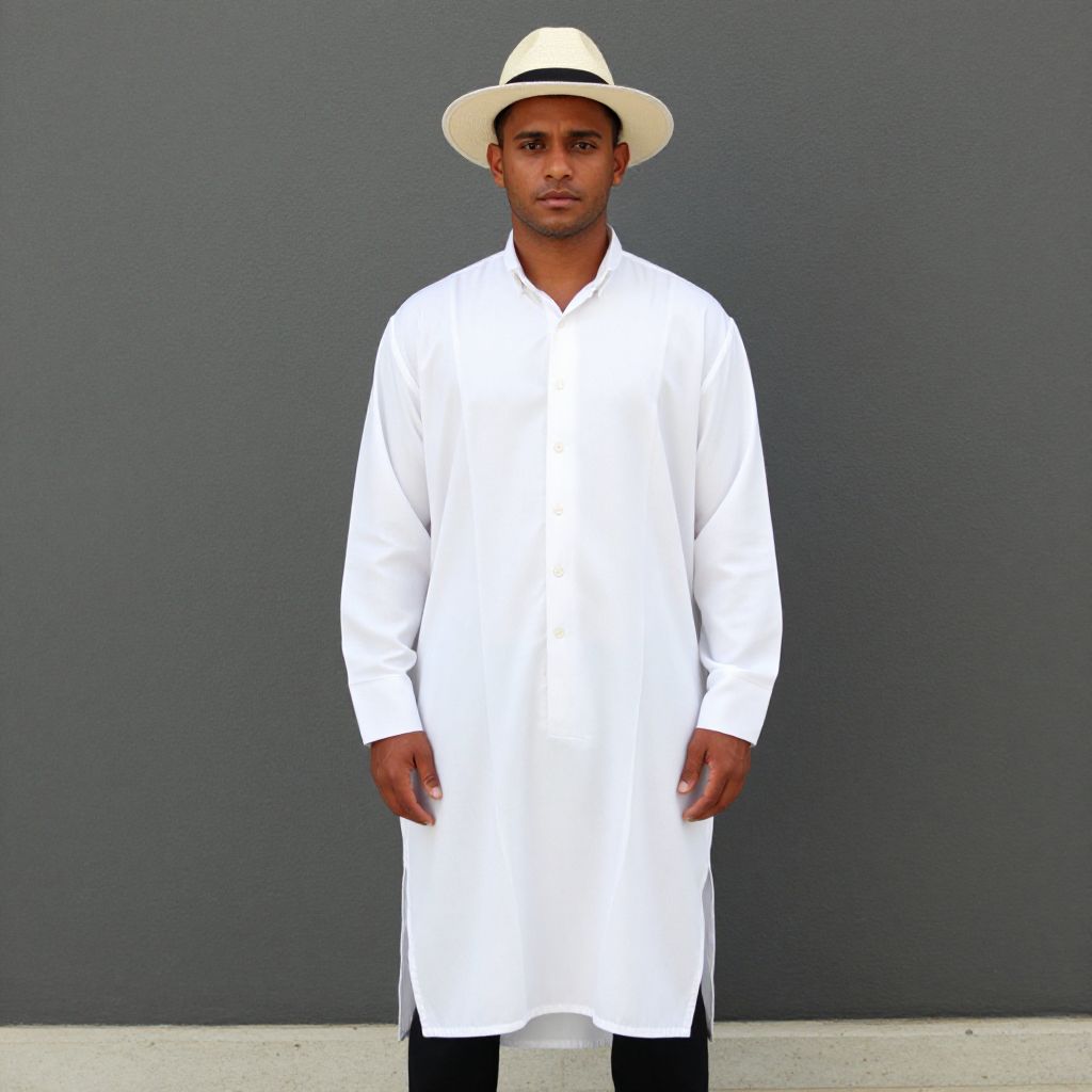 Photograph of a young man standing against a plain, dark gray wall. He has a medium brown complexion and short black hair. He wears a white, long-sleeved, knee-length traditional garment with a V-neck, paired with black pants. On his head is a cream-colored, wide-brimmed hat with a black band. His expression is neutral, and he stands with his hands relaxed at his sides. The wall behind him is smooth and unadorned, creating a simple, minimalist background that contrasts with his white outfit. The ground is a light gray concrete. The lighting is natural, highlighting his outfit and facial features evenly.