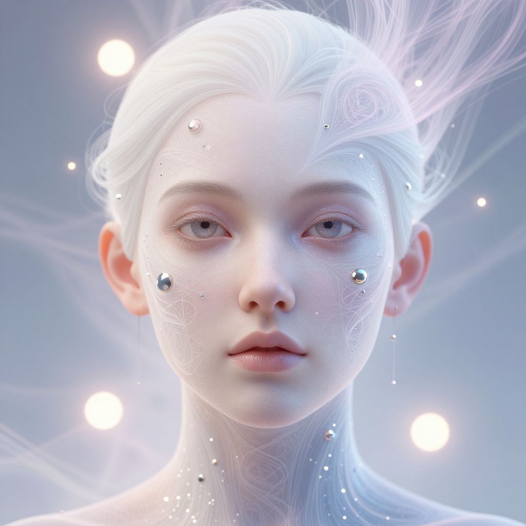 This is a digital CGI portrait of a pale, ethereal woman with porcelain skin and delicate features. She has white, wispy hair that radiates outward and small, silver beads scattered on her face and neck. Her light blue eyes are slightly downcast, and her lips are softly pink. The background is a gradient of light blue and white, with glowing white orbs of light floating around her. The image has a futuristic, almost otherworldly feel, with intricate, glowing patterns on her skin and a luminous, translucent quality to her hair and face. The style is highly detailed and surreal.