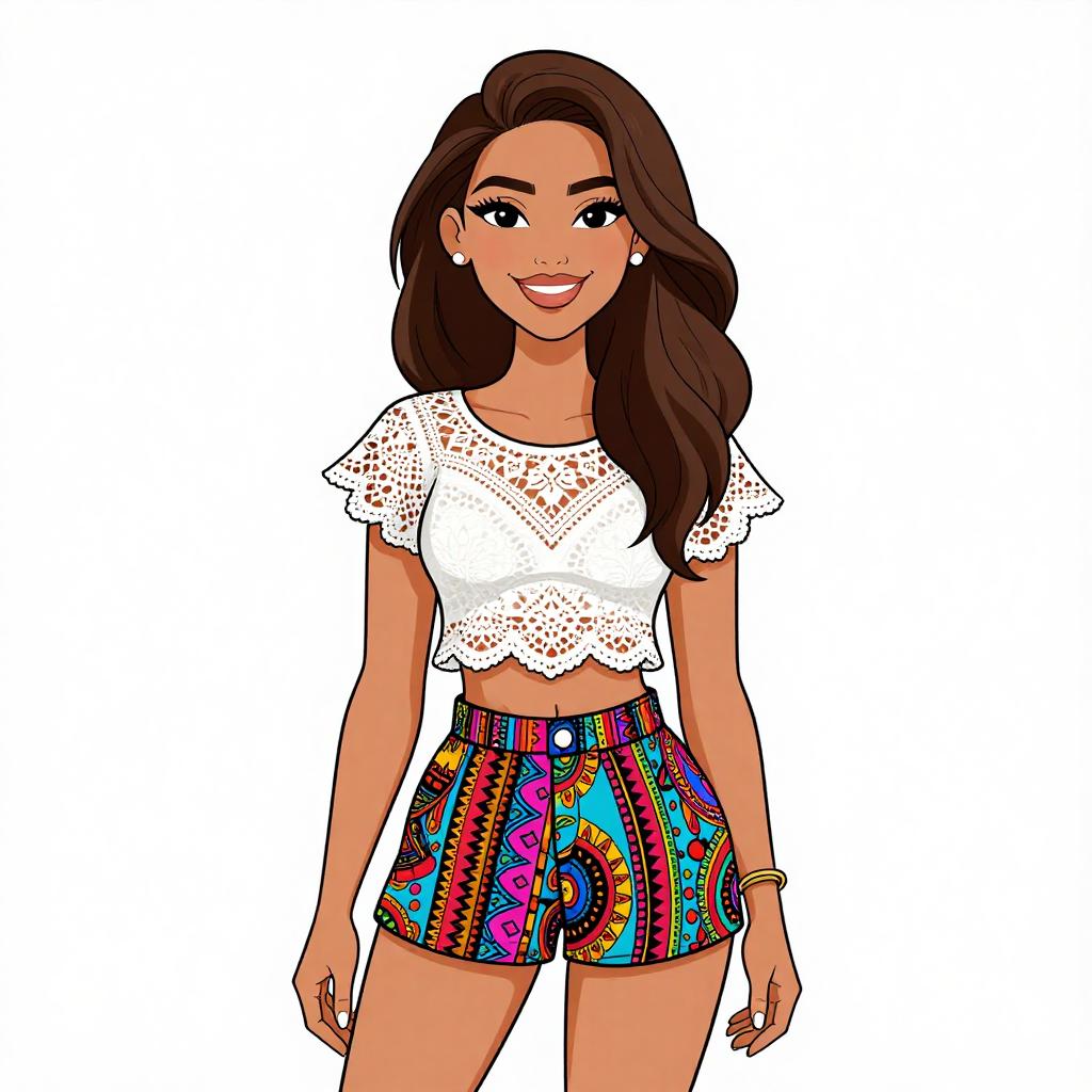 Woman with pretty face and pretty hair. smiling Woman, boho chic, sleeveless romper in snake print with paisley and geometric patterns, cream and navy colors, drawstring waist, thin adjustable spaghetti straps, V-neckline, short hem, relaxed fit, silver cuff bracelet, white backdrop. --sref 1467