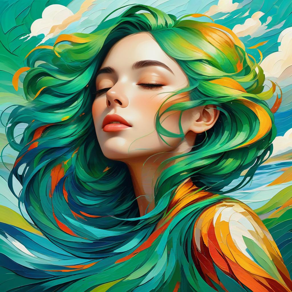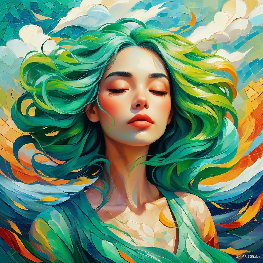 Colorful, stylized portrait of a woman with vibrant green hair flowing in the wind, eyes closed in a serene expression. Painted in a swirling, mosaic-like style with bold, swirling brushstrokes. Background features an abstract, dynamic landscape with a river, under a sky with expressive, swirling clouds. Warm tones create a sense of harmony and connection to nature.