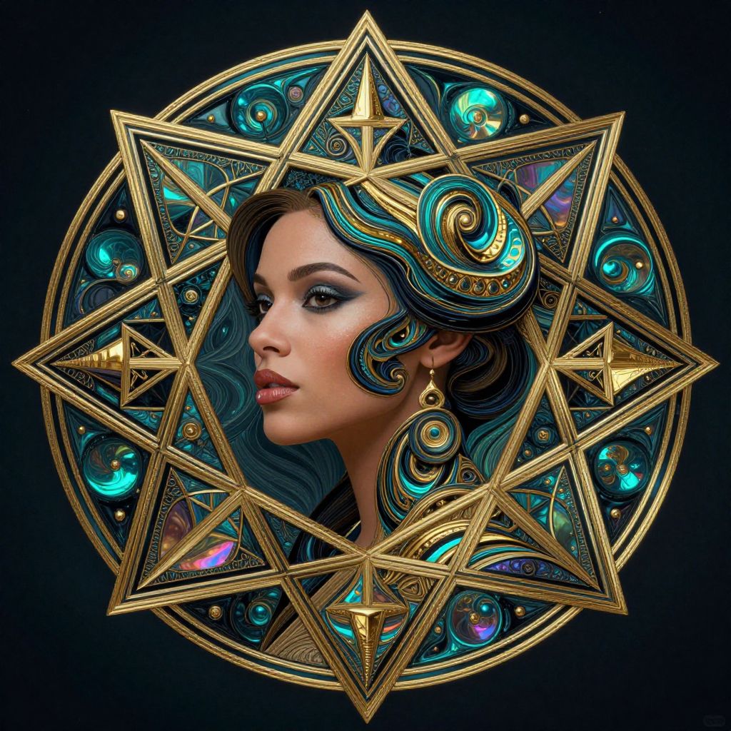 Digital artwork of a fair-skinned woman with dark, wavy hair adorned with gold and turquoise swirls, wearing gold hoop earrings. She gazes to the left with a serene expression. Her face is framed by a large, intricate golden star with glowing turquoise and blue patterns within its borders. The background is solid black, highlighting the vivid colors and metallic textures. The style combines elements of fantasy and surrealism, with a focus on elegant, mystical aesthetics. The woman's makeup is subtle, emphasizing her natural beauty.