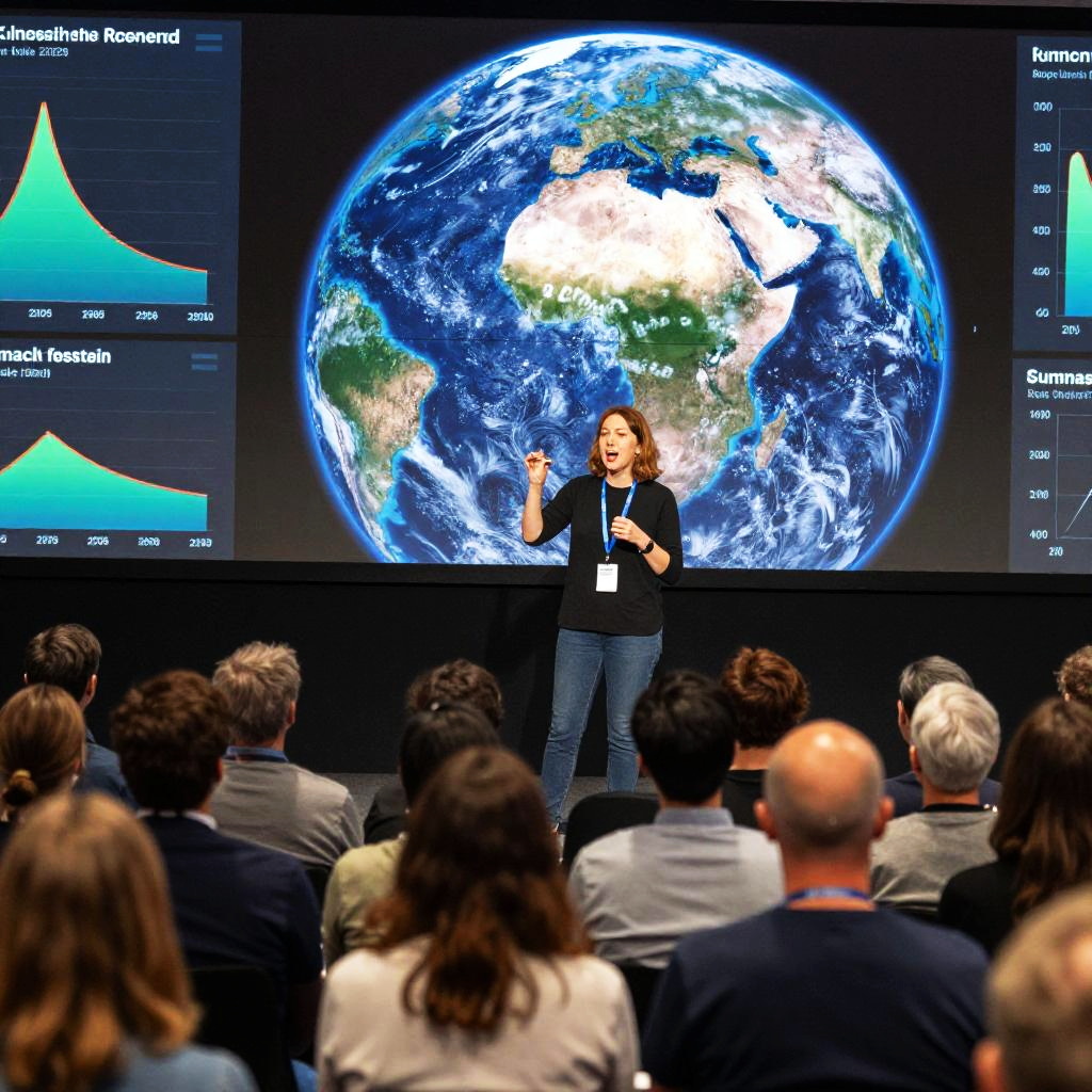 Portrait of a klimaaktivisten speaking passionately at an environmental conference, with a large audience listening attentively, digital screens showing graphs of climate change, and a backdrop of the Earth from space emphasizing global impact.