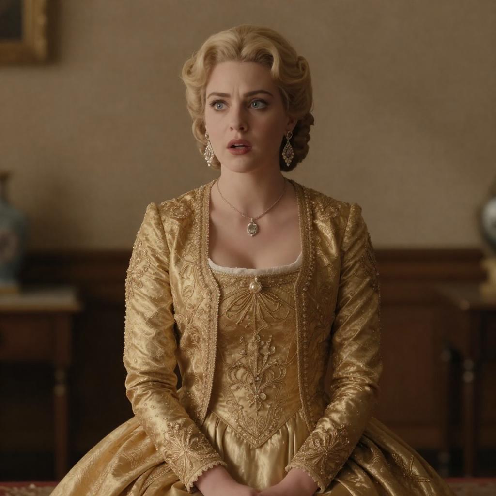 Surprised Blonde in Ornate Gold Gown