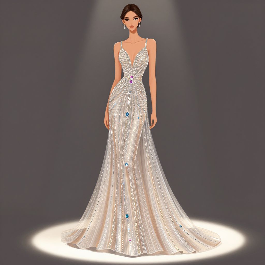 Bejeweled elegant evening gown embedded with sparkling crystals and precious stones, flowing fabric illuminated by soft spotlight, fashion illustration style, sophisticated and glamorous with a modern twist