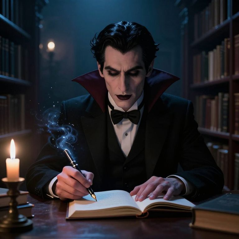 Photorealistic digital artwork of a dark-haired, pale-skinned vampire in a black tuxedo, writing in an open book with a smoking qu