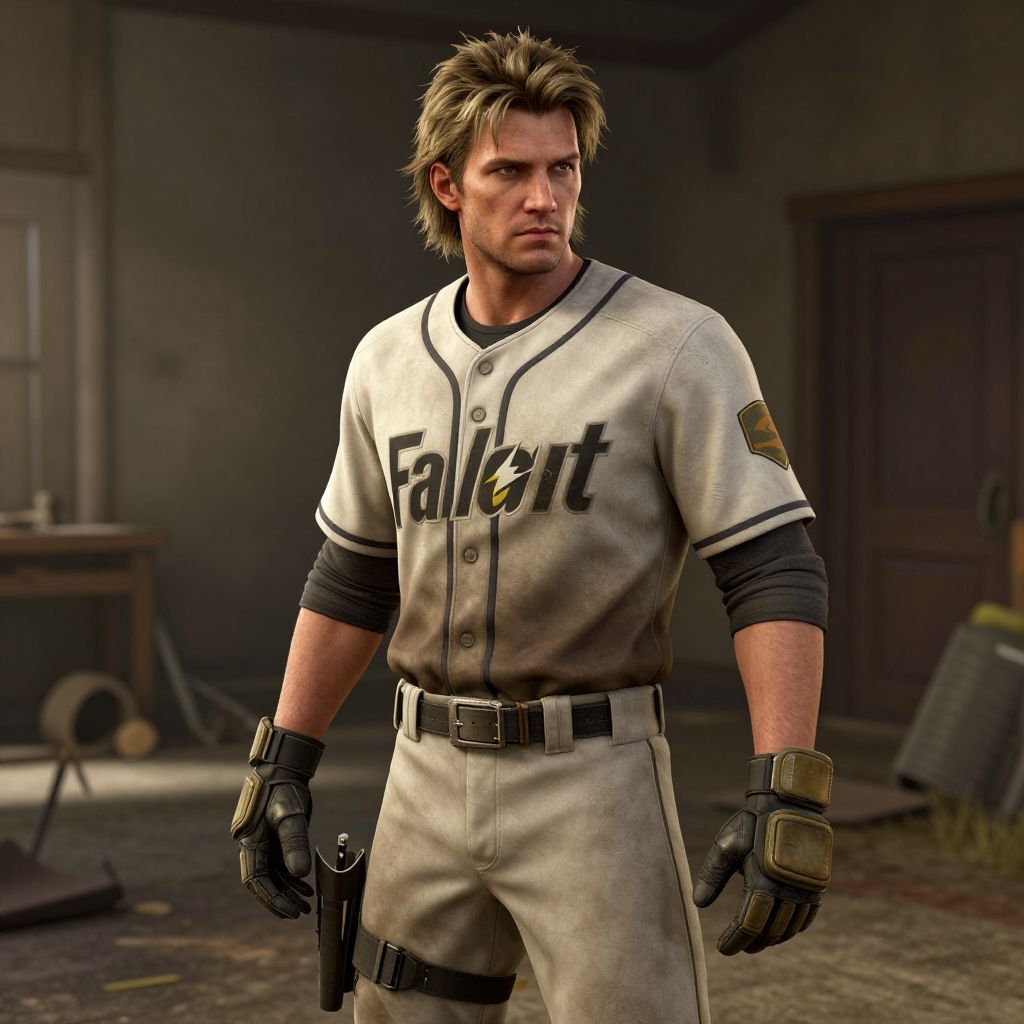 Identity man with dirty blond hair in his mid 20s, post apocalypse, Fallout 4, baseball uniform, military gauntlets,