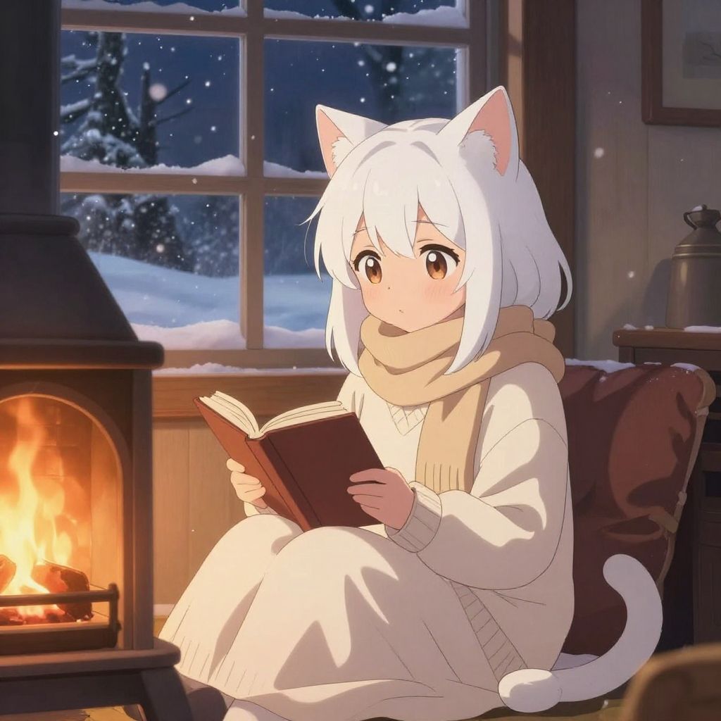 Anime white cat girl in a cozy winter setting, wearing a warm sweater and scarf, curled up with a book by the fireplace, soft lighting and gentle snowfall outside a window, warm and inviting atmosphere