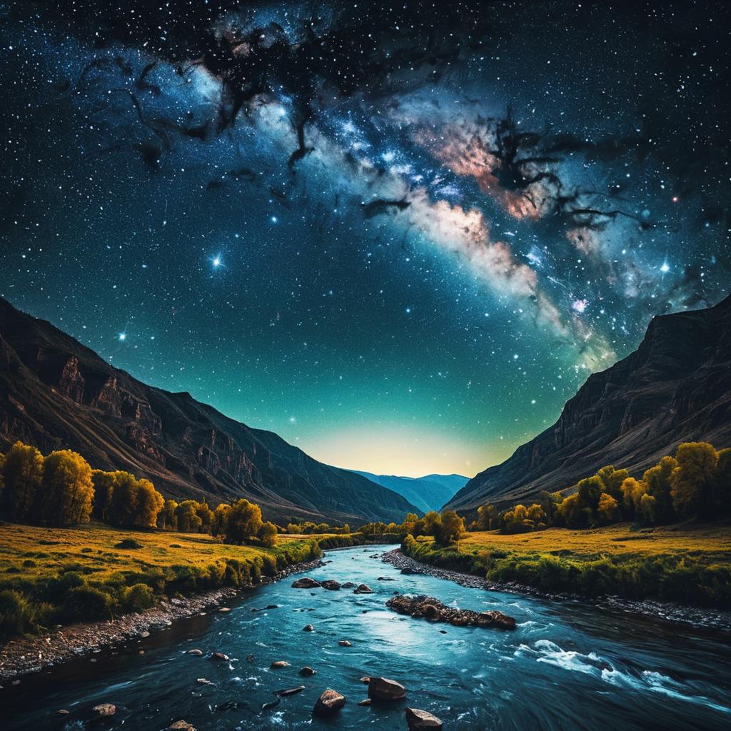 A stunning river landscape winding through a deep valley with rocky cliffs on either side. Above, the vibrant, detailed night sky displays the galactic center with a celestial atmosphere, numerous stars, and a shooting star. The scene combines elements of fantasy and realism inspired by the style of John Atkinson Grimshaw, characterized by vivid colors and dramatic lighting.