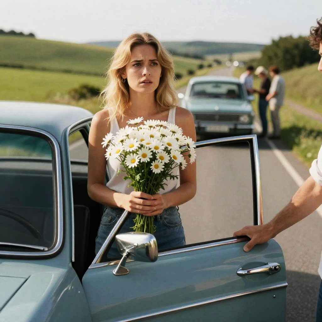 Photograph of a garden scene. Blonde woman in white, one-shoulder dress, standing on red platform, arm raised. Man in white shirt, gray vest, black pants, painting large floral painting on canvas. Sunflowers, foliage, greenery in background. Man's back to camera. Woman's right side visible. Bright sunlight. Artist focused on painting.