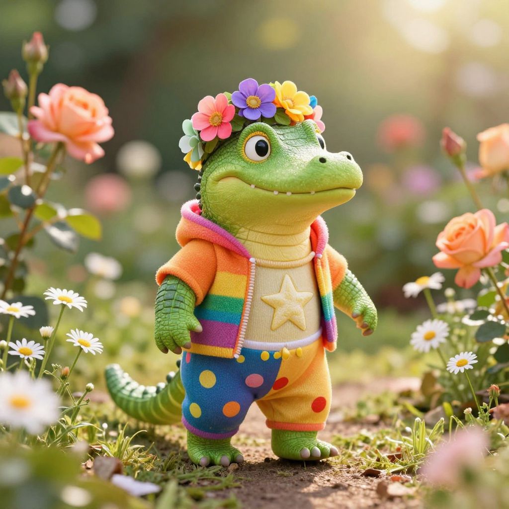 Photograph of a colorful, anthropomorphic green crocodile toy standing in a sunlit, floral garden. The crocodile wears a rainbow-striped hoodie, orange pants with large yellow and red polka dots, and a star-shaped patch on its chest. A vibrant flower crown adorns its head. The background features soft-focus pink roses and white daisies, with sunlight filtering through the greenery, creating a warm, cheerful atmosphere. The crocodile's textured skin and stitched seams add a tactile element to the whimsical scene.