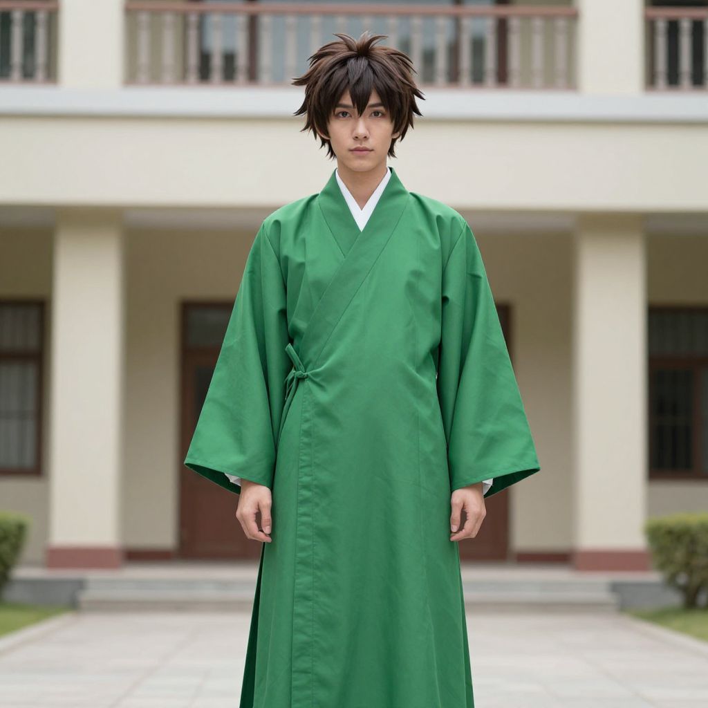 Deku Movie Costume, a man in a green robe standing in front of a building