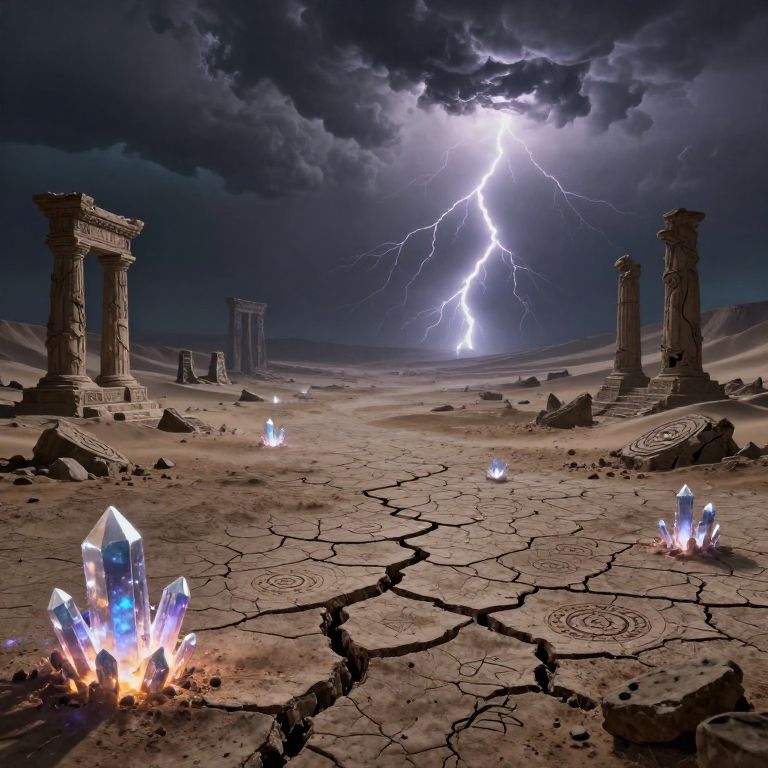 This digital artwork depicts a surreal, post-apocalyptic landscape under a dramatic, lightning-filled sky. The cracked, barren ground stretches into the distance, dotted with glowing, multi-colored crystals in the foreground. Ruins of ancient, weathered stone columns stand in the middle and background, their intricate carvings partially obscured by shadows. The sky is dark with ominous, swirling clouds, and a bright, jagged bolt of lightning illuminates the scene, casting stark shadows. The crystals emit a soft blue, purple, and orange light, contrasting with the dark, cracked earth and the stormy sky. The overall tone is mystical and foreboding.