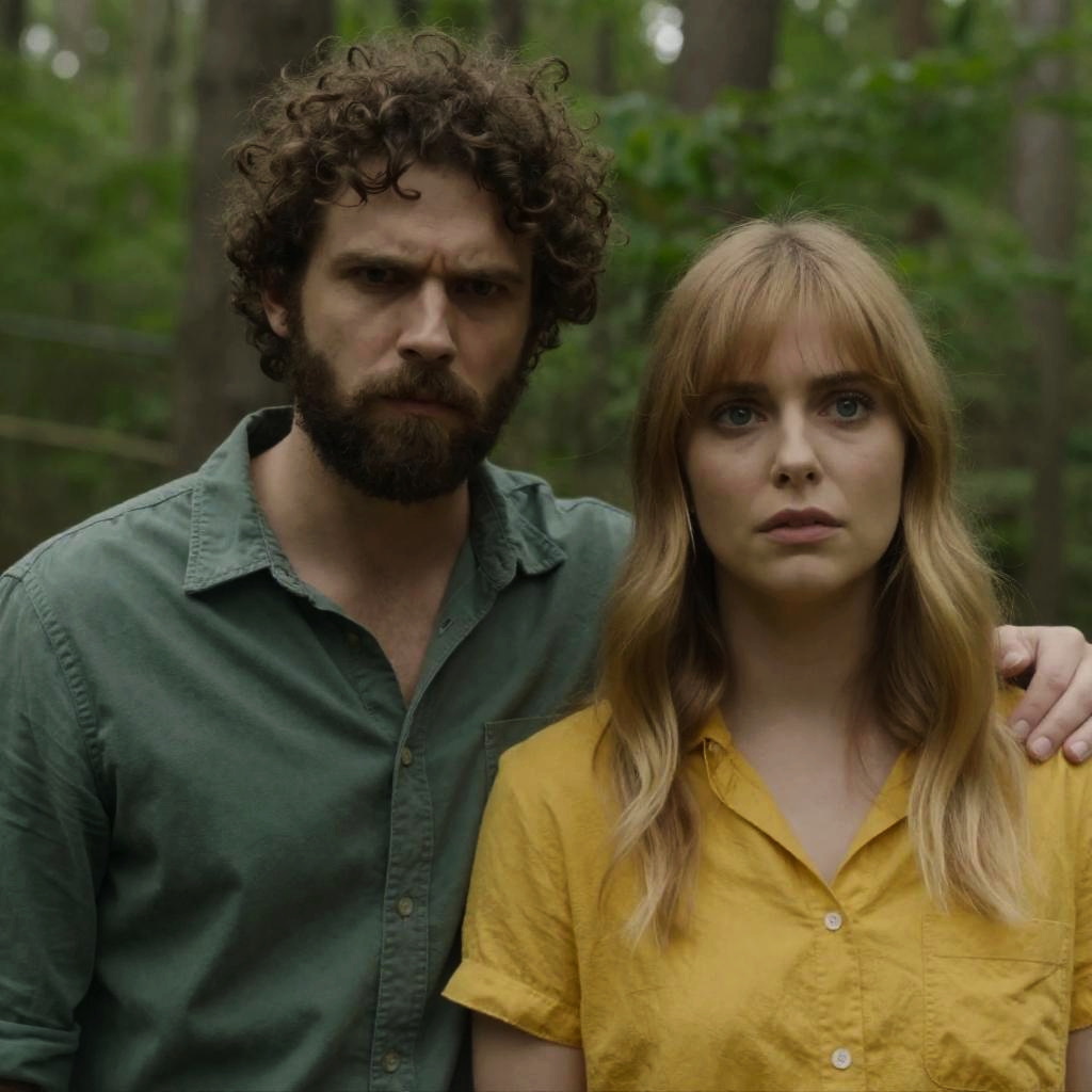 Man with short, curly hair and beard, wearing a red shirt and jeans, holding a knife, stands in front of a fence. A small, wooden gazebo is to the left. Orange, ured background. Intense expression.