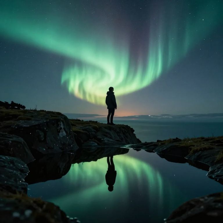 Photograph of a serene, midnight forest lake scene under a vibrant display of the Northern Lights. Bright green, purple, and yellow auroras swirl in the night sky, reflected on the still, dark water. Silhouetted pine trees frame the foreground and background, with a large, arching tree branch in the right foreground. The sky is dotted with faint stars, adding to the mystical atmosphere. The ground near the water is covered in moss and small rocks, enhancing the natural, untouched feel of the scene. The overall image has a tranquil, almost magical quality.