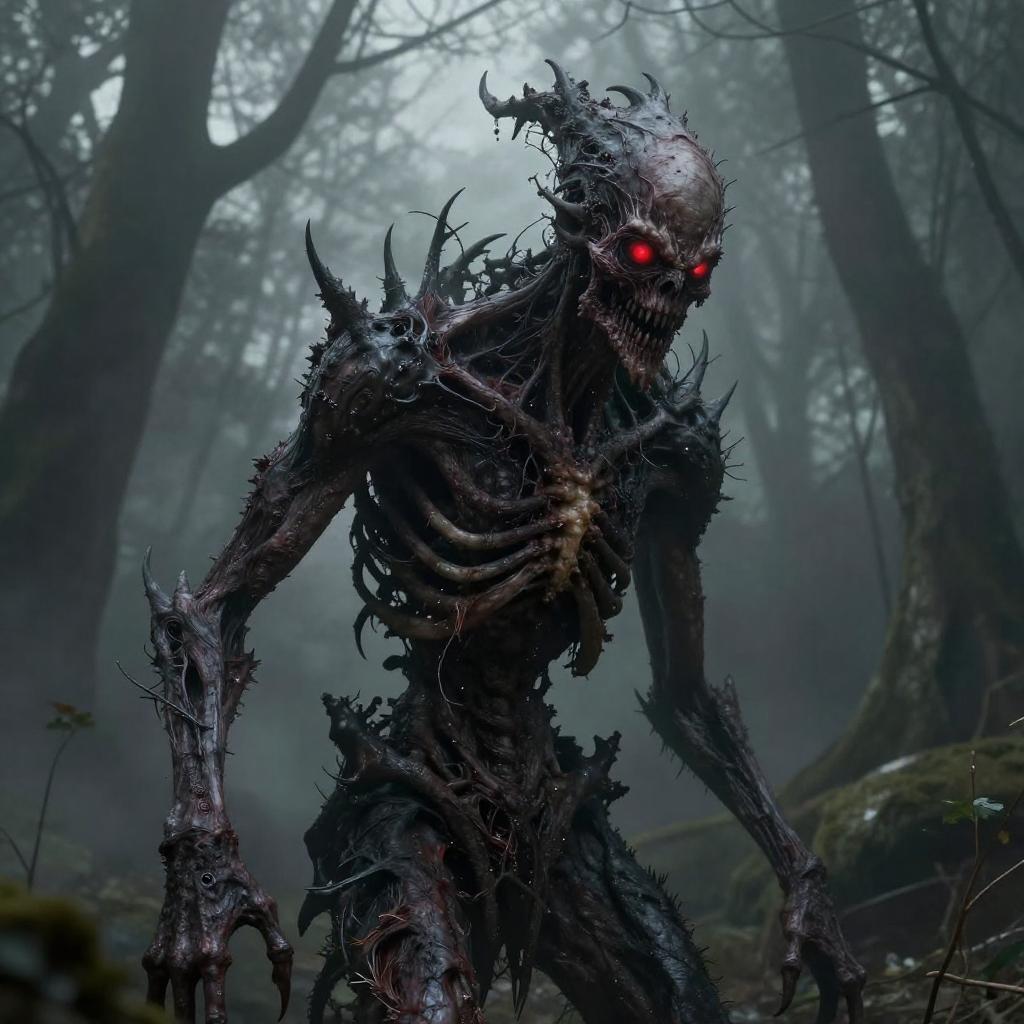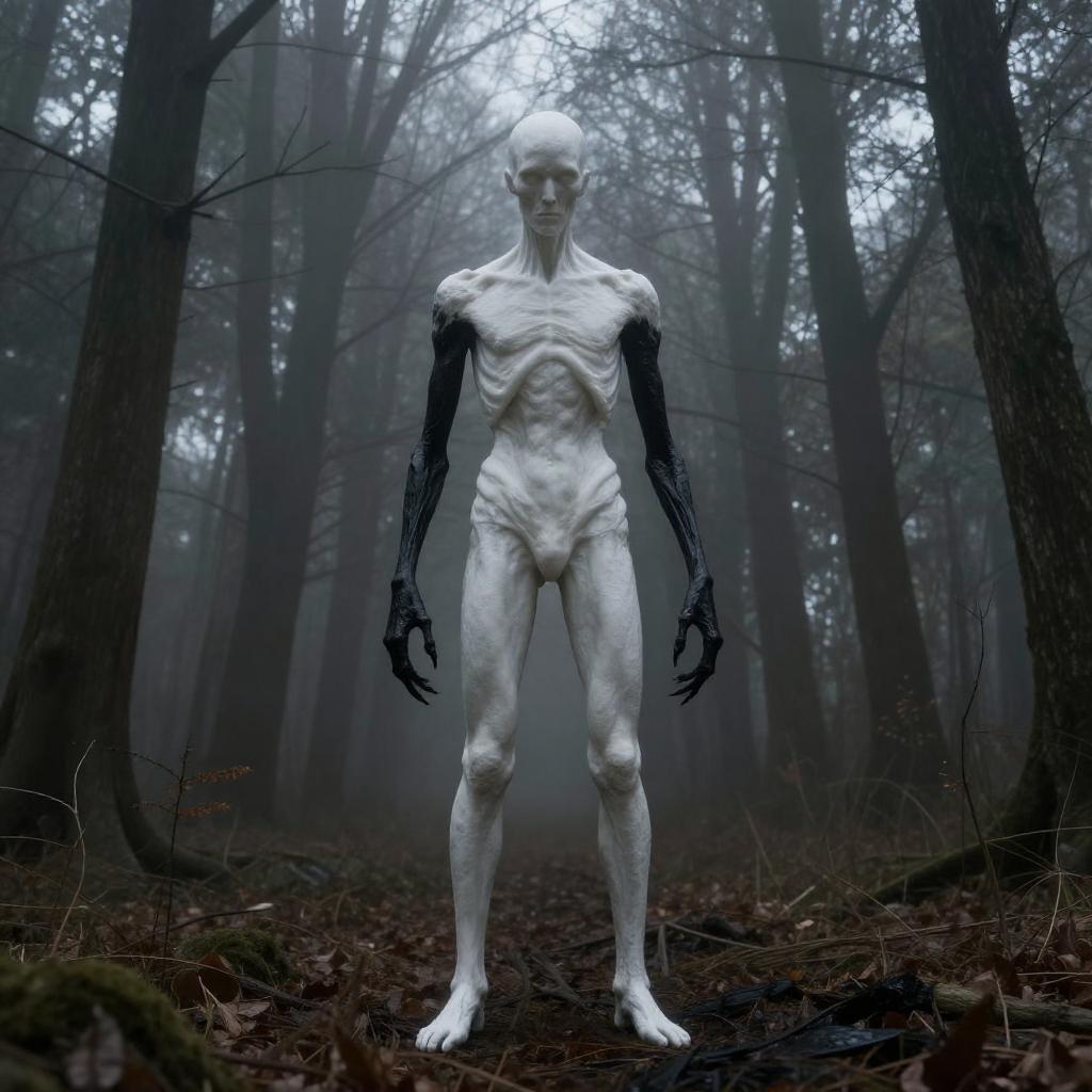 Hyperrealistic image of a nightmarish shadowy figure with elongated black limbs and visible veins, featuring a contrasting pure white body. The figure stands centrally in a dense, fog-covered forest with tall, barren trees, creating a sinister and eerie atmosphere.