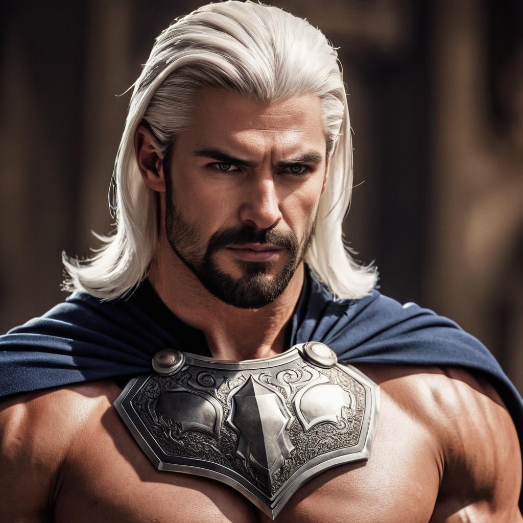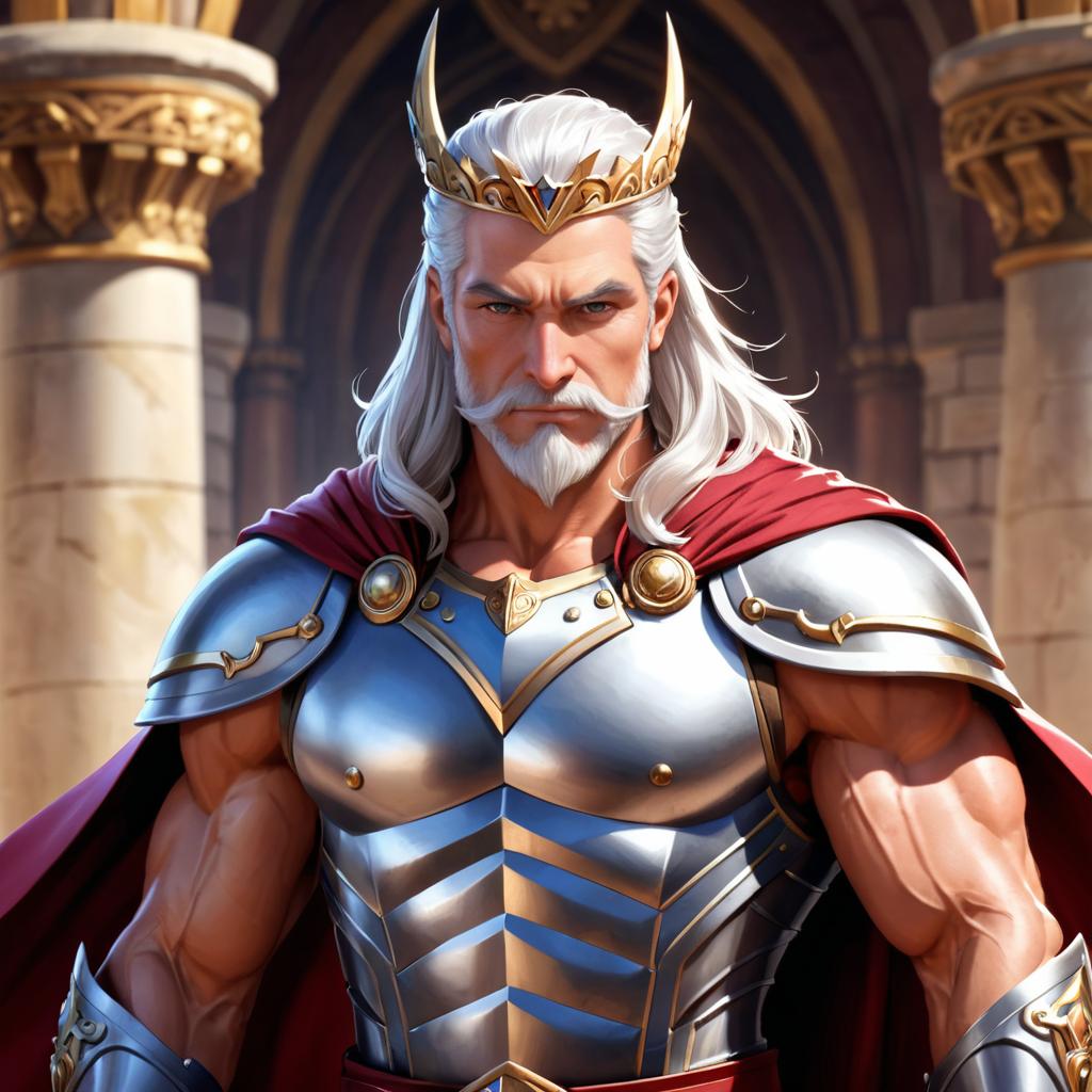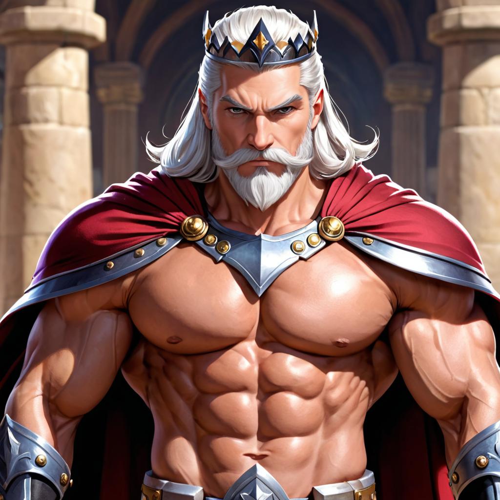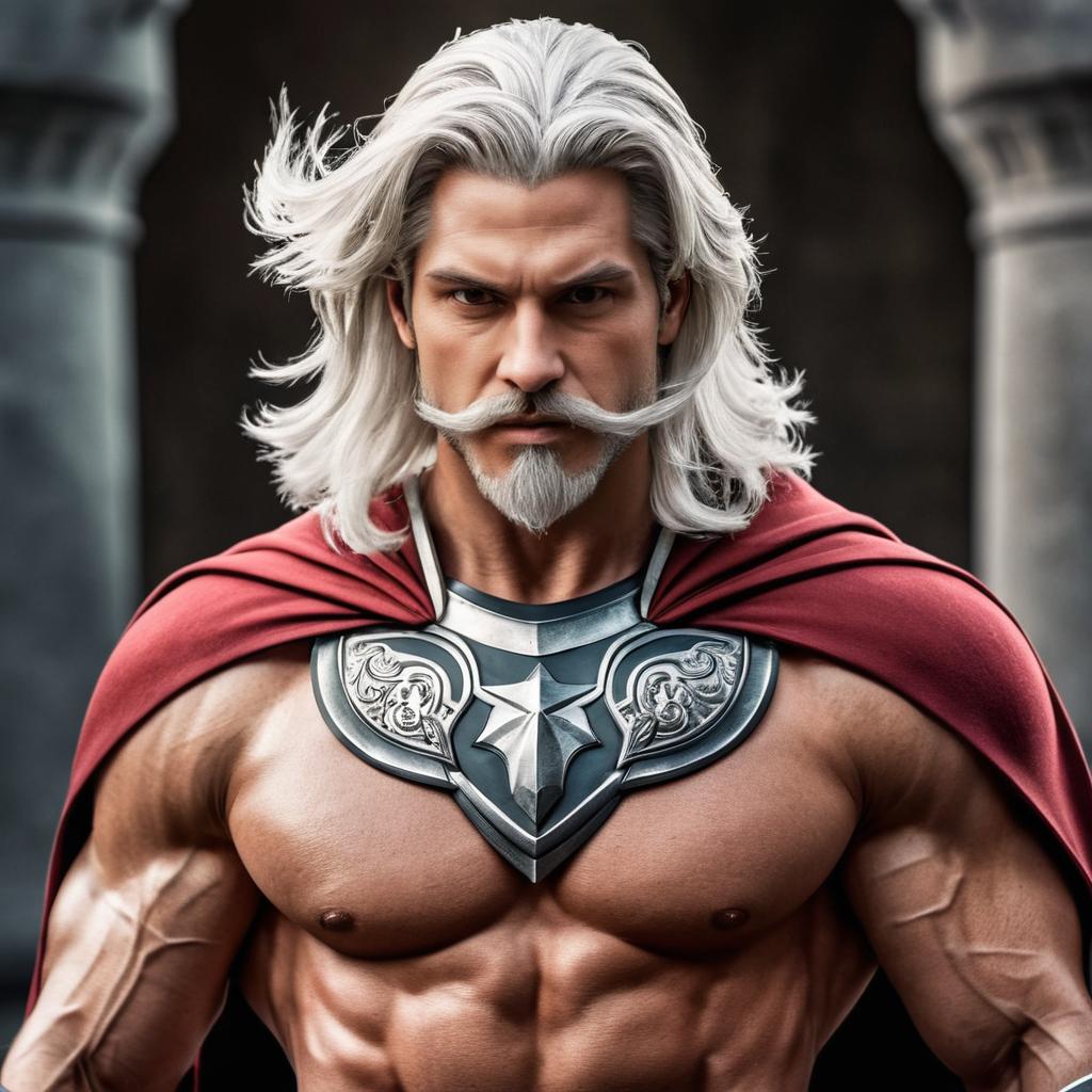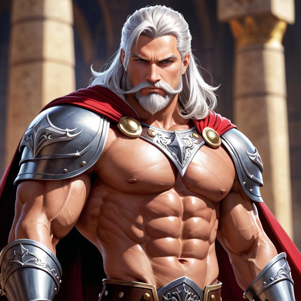 1boy, muscular, male focus, solo, facial hair, beard, abs, muscular male, manly, pointy ears, pectorals, nipples, mustache, cape, pillar, armor, mature male, upper body, long hair, bara, white hair, crown, looking at viewer, large pectorals, helmet