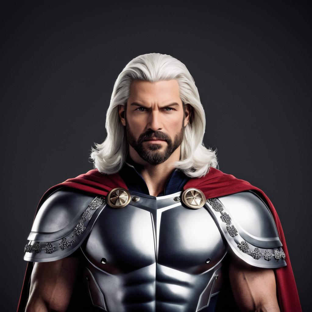 Close-up of a serious man wearing detailed silver medieval-style armor with a red cape. The armor includes shoulder plates and a chest piece with intricate designs. The man has long brown hair and a trimmed beard.