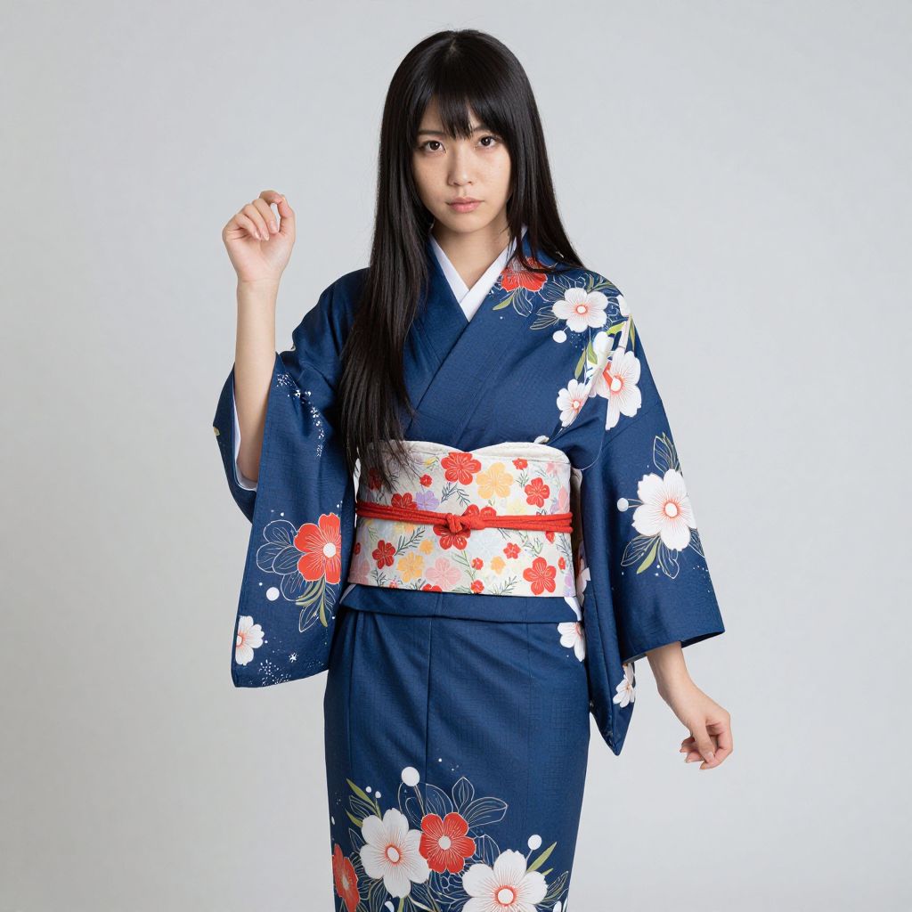 Photograph of an Asian woman with long black hair and bangs, standing against a plain white background. She wears a navy blue kimono adorned with white and red floral patterns, and a white and red floral obi (belt) around her waist. The kimono's sleeves are wide and flowy, and she holds up her right hand slightly, with a neutral expression on her face. The texture of the kimono is smooth and slightly glossy. The floral designs are vibrant and detailed, adding a touch of elegance to the traditional garment.