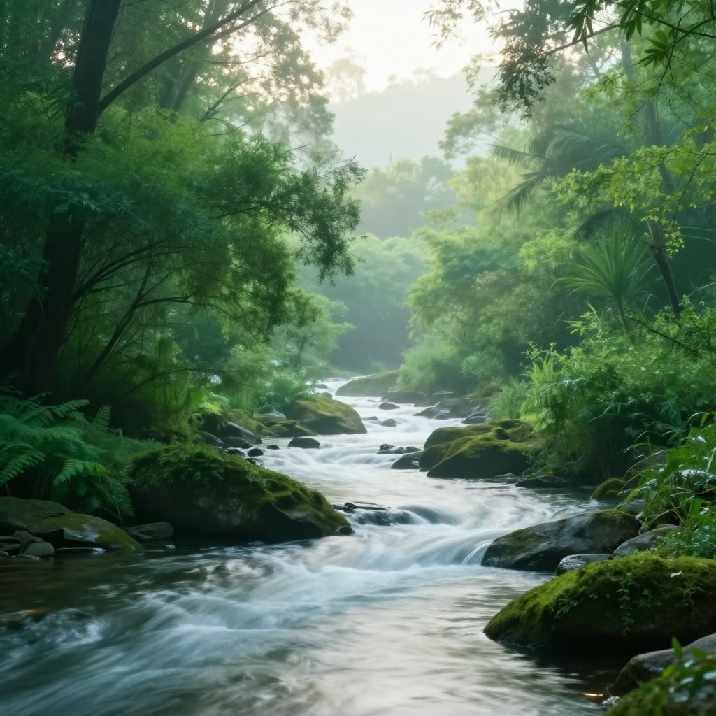 A swift-flowing river amid rocky terrain, with vibrant wildflowers growing along the banks and a mist rising from the rushing water in the early morning light.