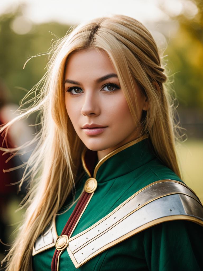 Photo-realistic close-up portrait of a young woman with long blonde hair styled in a side ponytail, wearing a detailed green Alisha Diphda cosplay costume with gold buttons and red accents. She has striking green eyes and a calm expression, set against a softly blurred natural background with warm lighting.