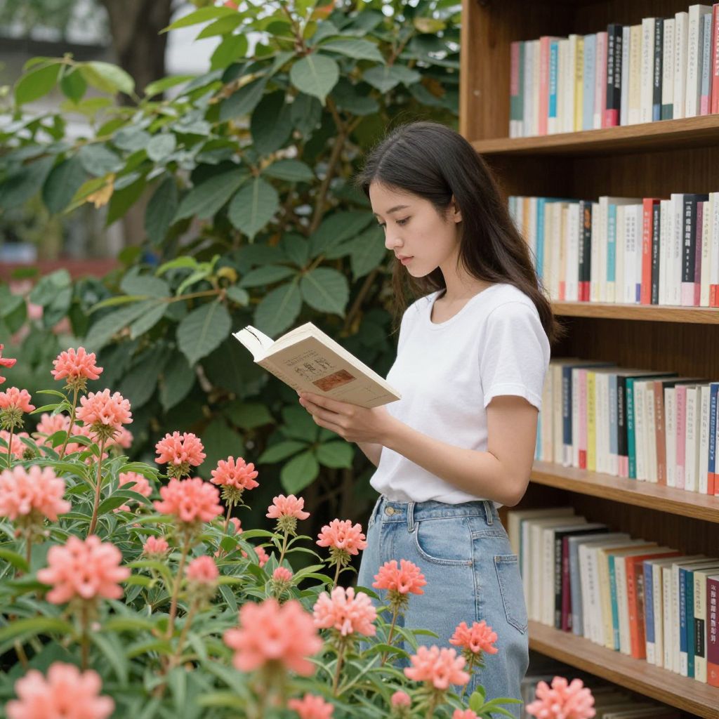 Photograph of an Asian woman with long black hair, wearing a white t-shirt and blue high-waisted jeans, standing beside a wooden bookshelf filled with colorful books. She is intently reading a book with a beige cover, standing in front of lush green foliage. Bright pink flowers in the foreground add a vibrant touch, contrasting with the greenery and wooden shelves. The setting appears to be an outdoor garden library, blending nature and literature. The woman's focused expression and relaxed posture convey a peaceful, studious atmosphere.