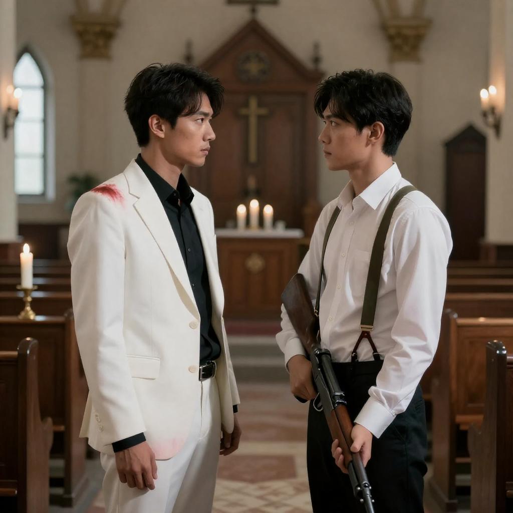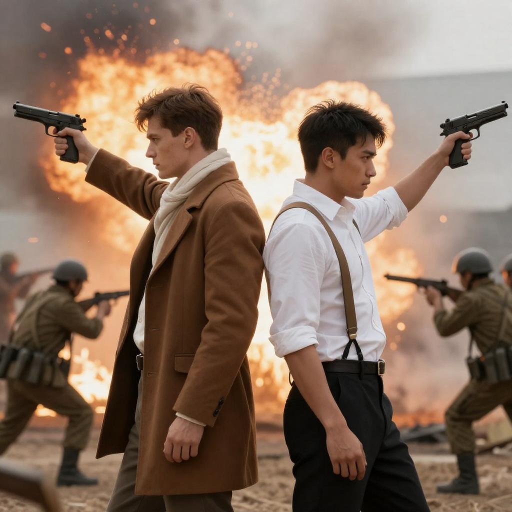 Two men back-to-back, holding guns, in action poses. The man on the left wears a brown coat with a white scarf, brown hair, neutral expression. The man on the right wears a white shirt with suspenders, black hair, focused expression. Background: explosion, soldiers in battle, intense fire, intense action scene.