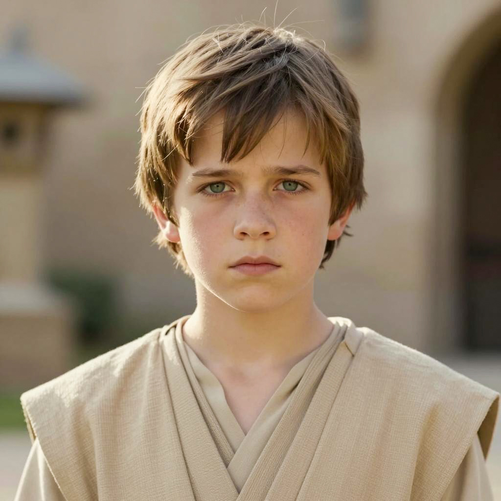 Obi wan kenobi costume boy, photorealistic, young boy, short brown hair, green eyes, serious expression, wearing beige tunic, soft sunlight, blurred background, stone buildings, close-up, upper body, realistic ures, natural light, slight shadow on face, daytime, soft focus, detailed hair strands, subtle lighting, outdoors, calm atmosphere, realistic skin tones