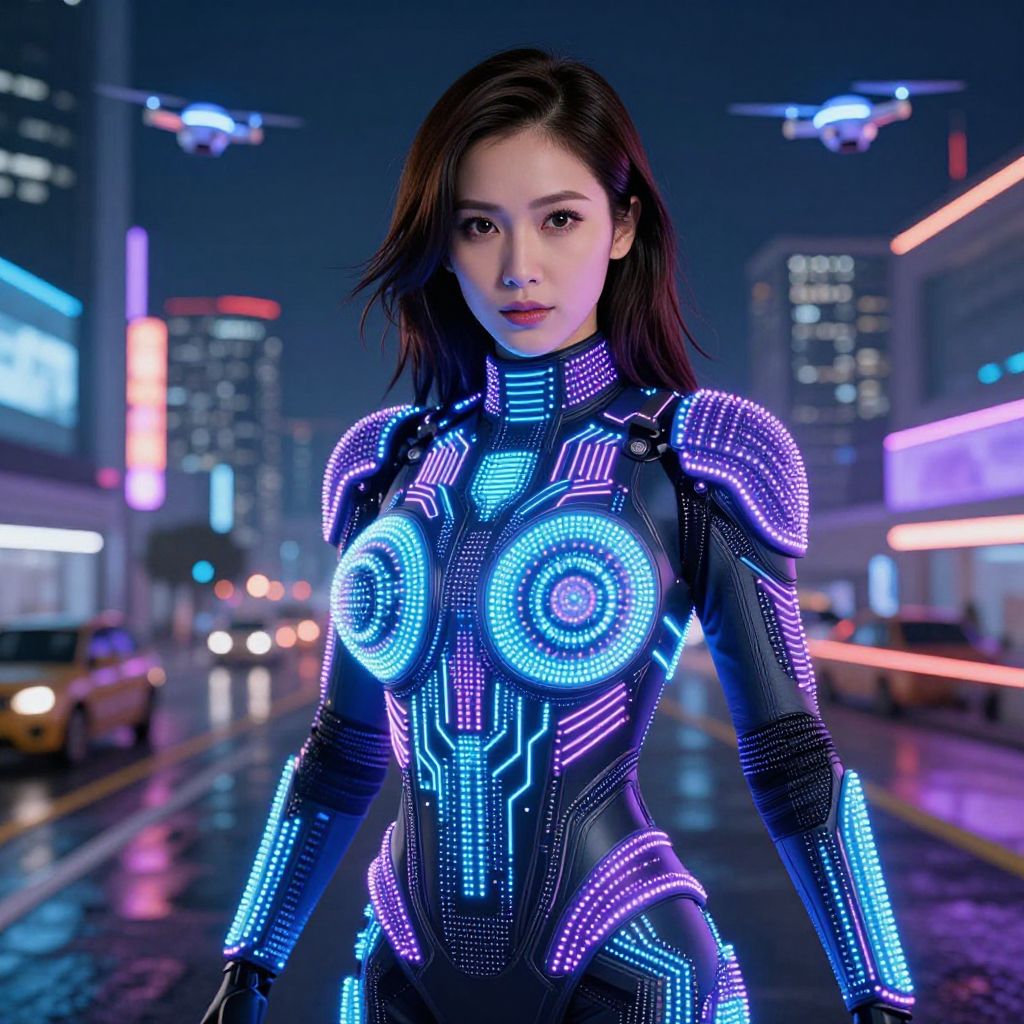 A woman in her early 30s with dark brown hair and sharp, confident features wears an elaborate LED light costume with glowing blue and purple circuits that pulse across her body, set against a futuristic city skyline at night with neon reflections on wet streets and flying drones in the background, illuminated by the dynamic LED patterns that respond to her movements.. The woman has big tits and cute face