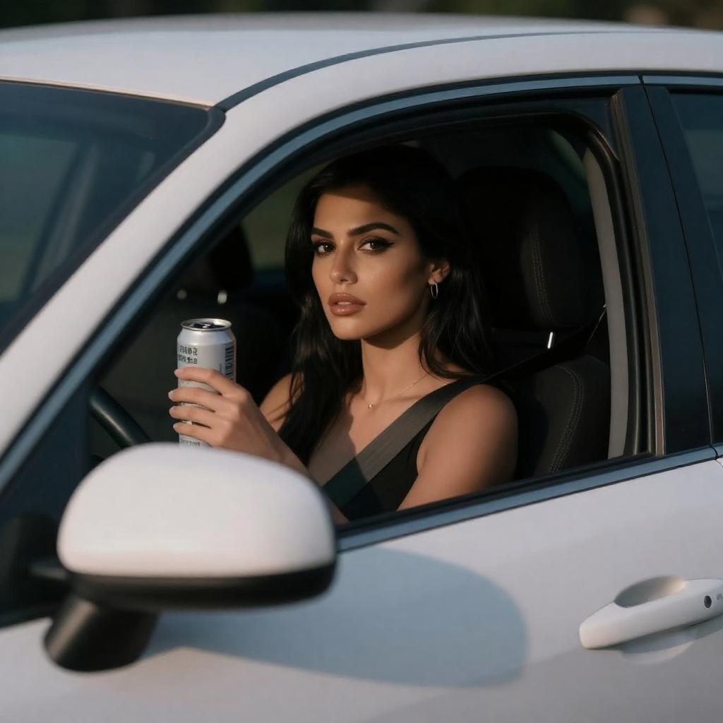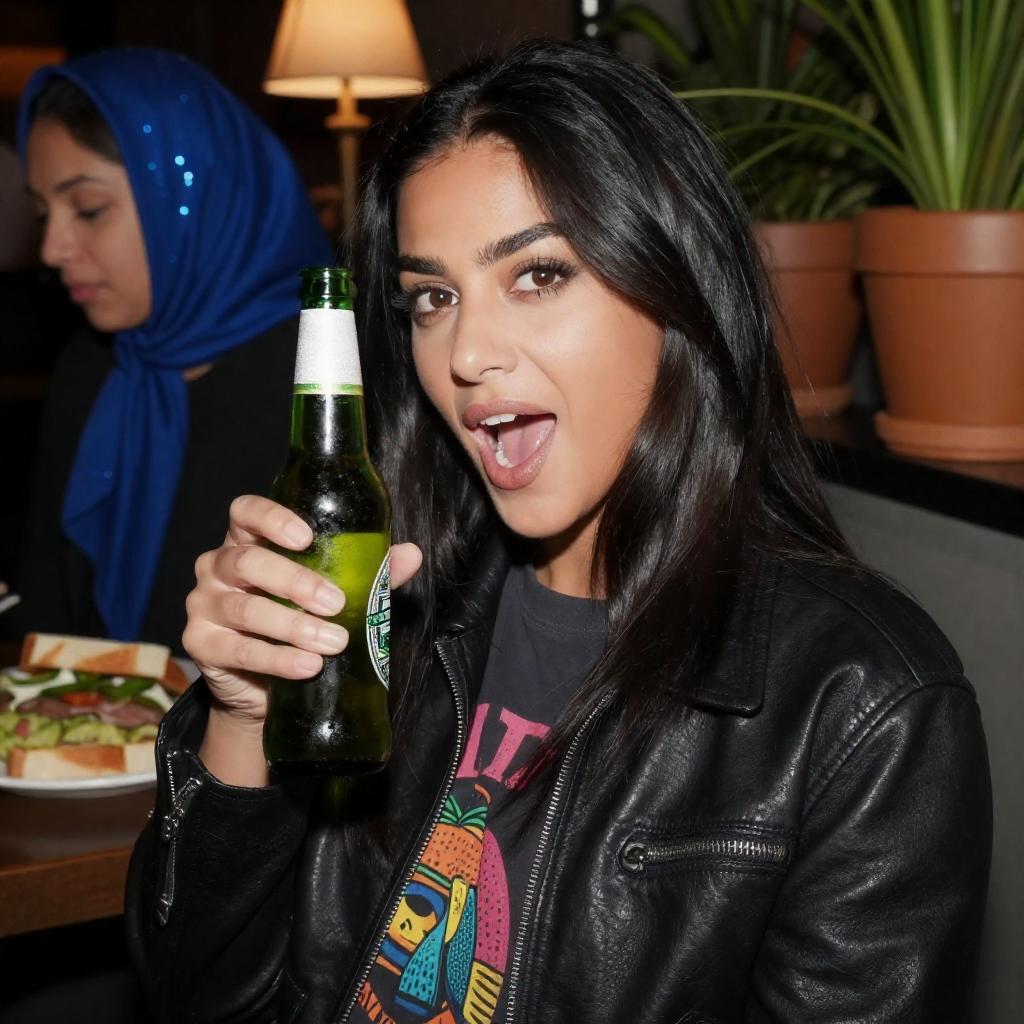 Photograph of a woman with long black hair, wearing a black leather jacket and a colorful graphic t-shirt, holding a green beer bottle in her right hand. She has an open-mouthed, playful expression. In the background, a person in a blue, sequined headscarf sits with a plate of sandwiches. Potted plants and a lamp are visible behind them.